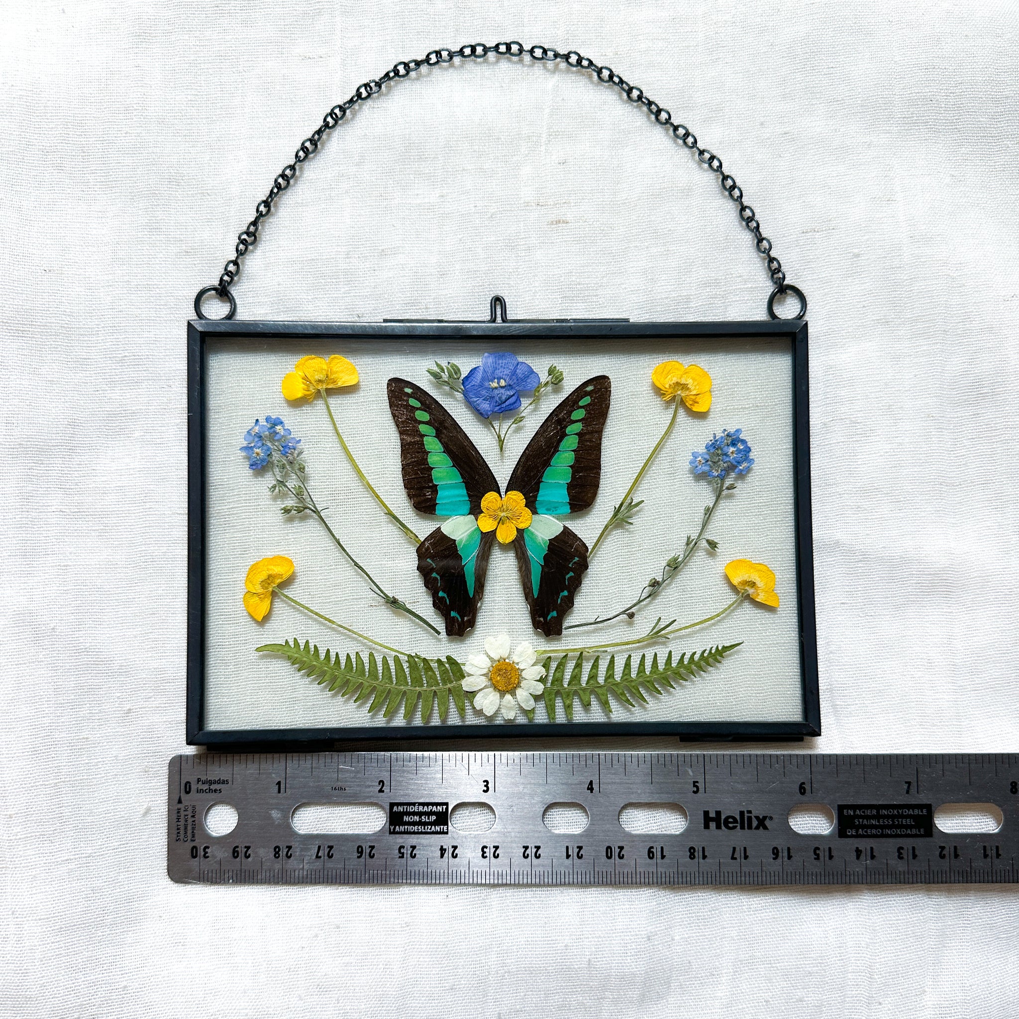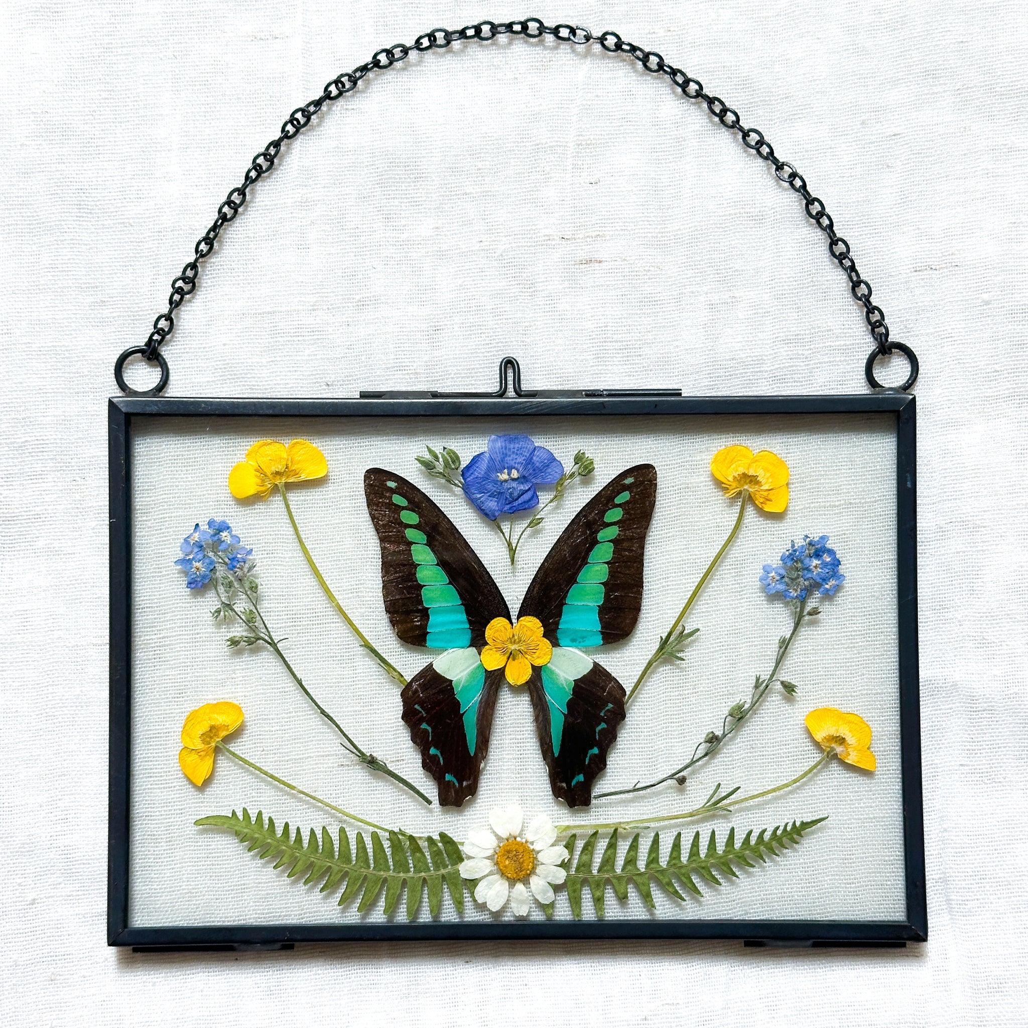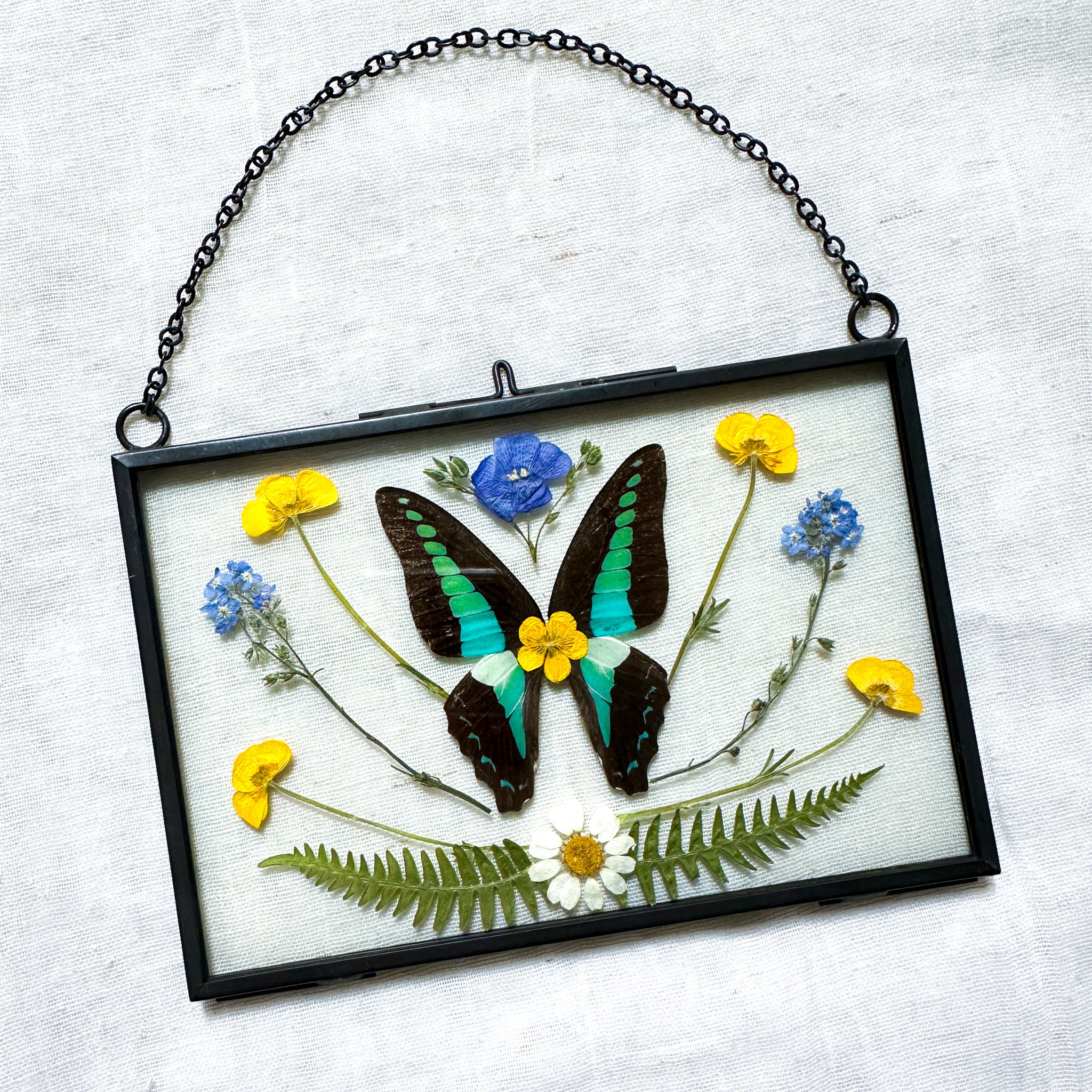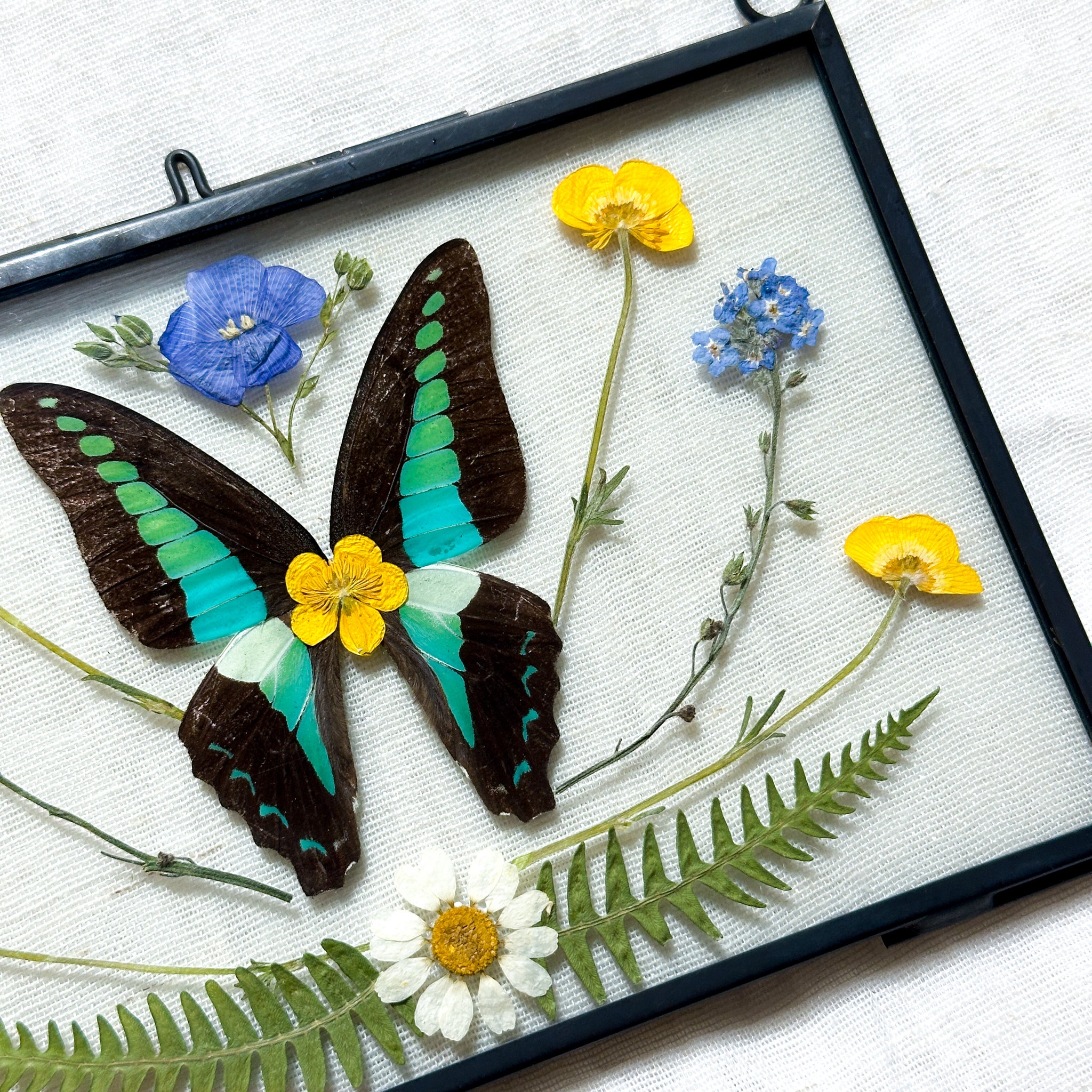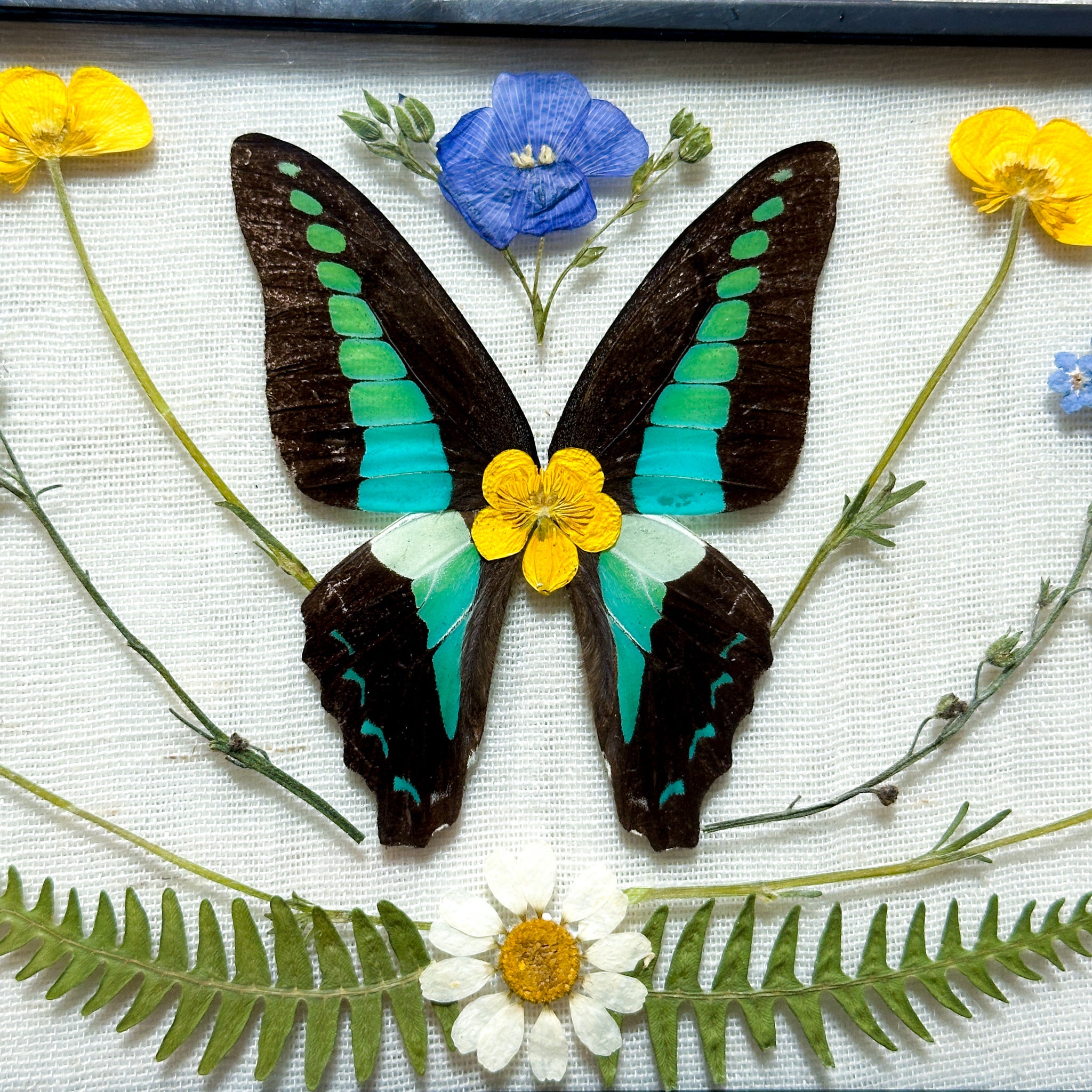 Real bluebottle butterfly wings and hand-foraged pressed wildflowers.