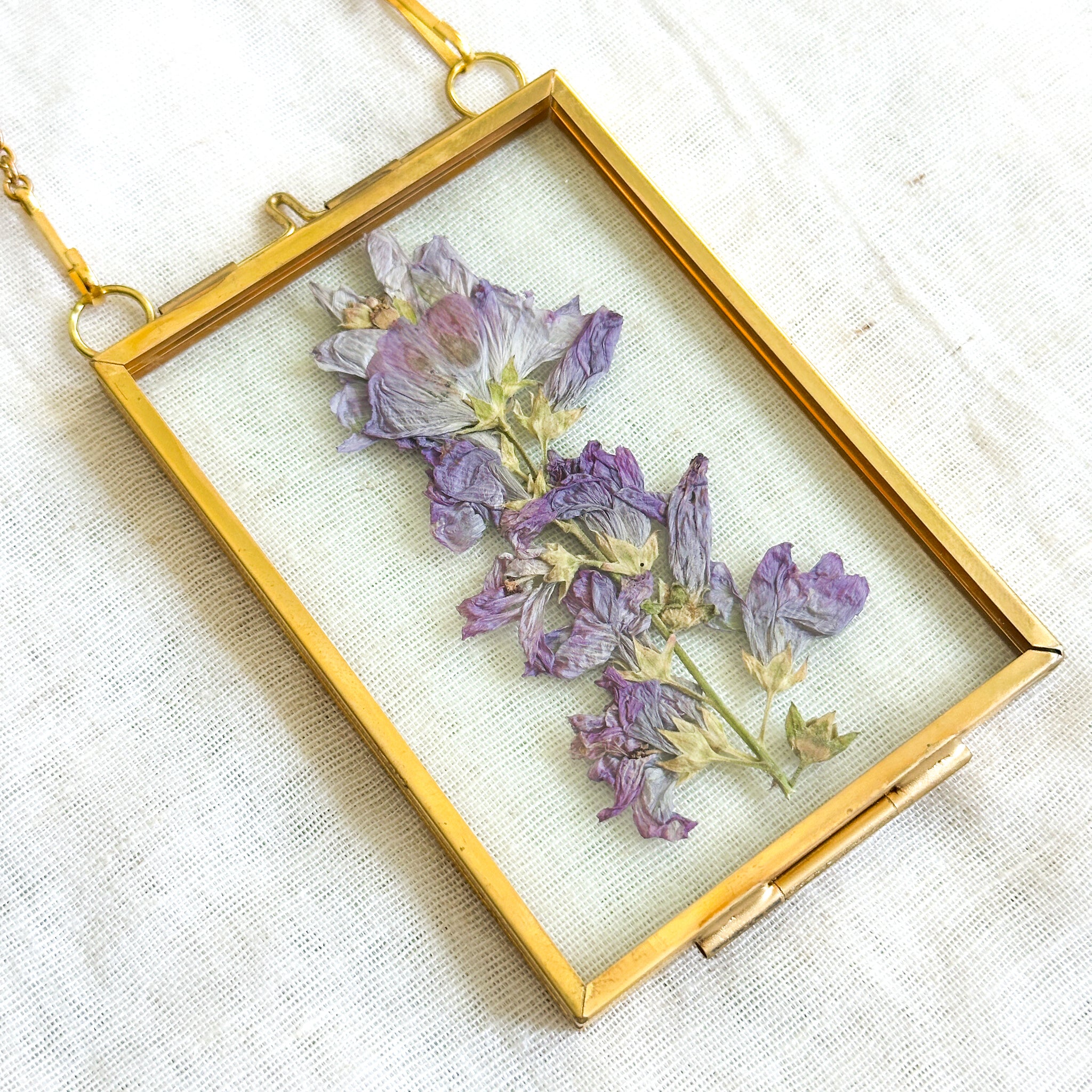 Hand-foraged and hand-pressed checkerbloom encased in glass frame with brass hardware.